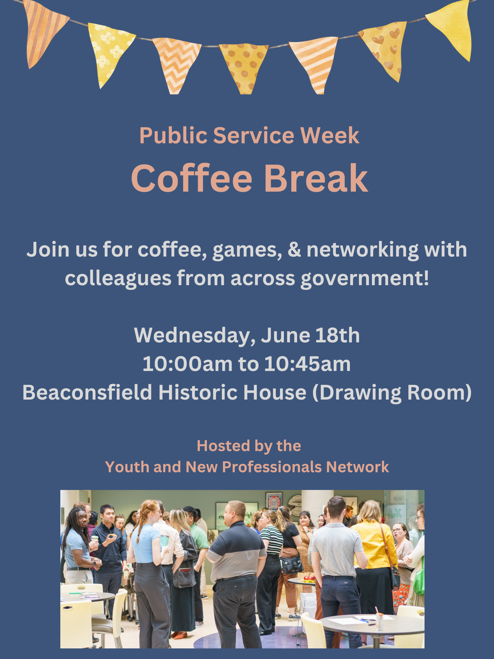Join fellow colleagues from across the government who are early in their public service careers for coffee, games, and networking. As the public service prepares for the changing demographics of the workforce, it is important for young or new public service professionals to come together, connect, and discuss opportunities to continue upholding the guiding values of respect, integrity, accountability, and excellence. Whether you’re young, young at heart, or early in your public service career, we welcome you to join us for snacks, refreshments, and engaging discussions.